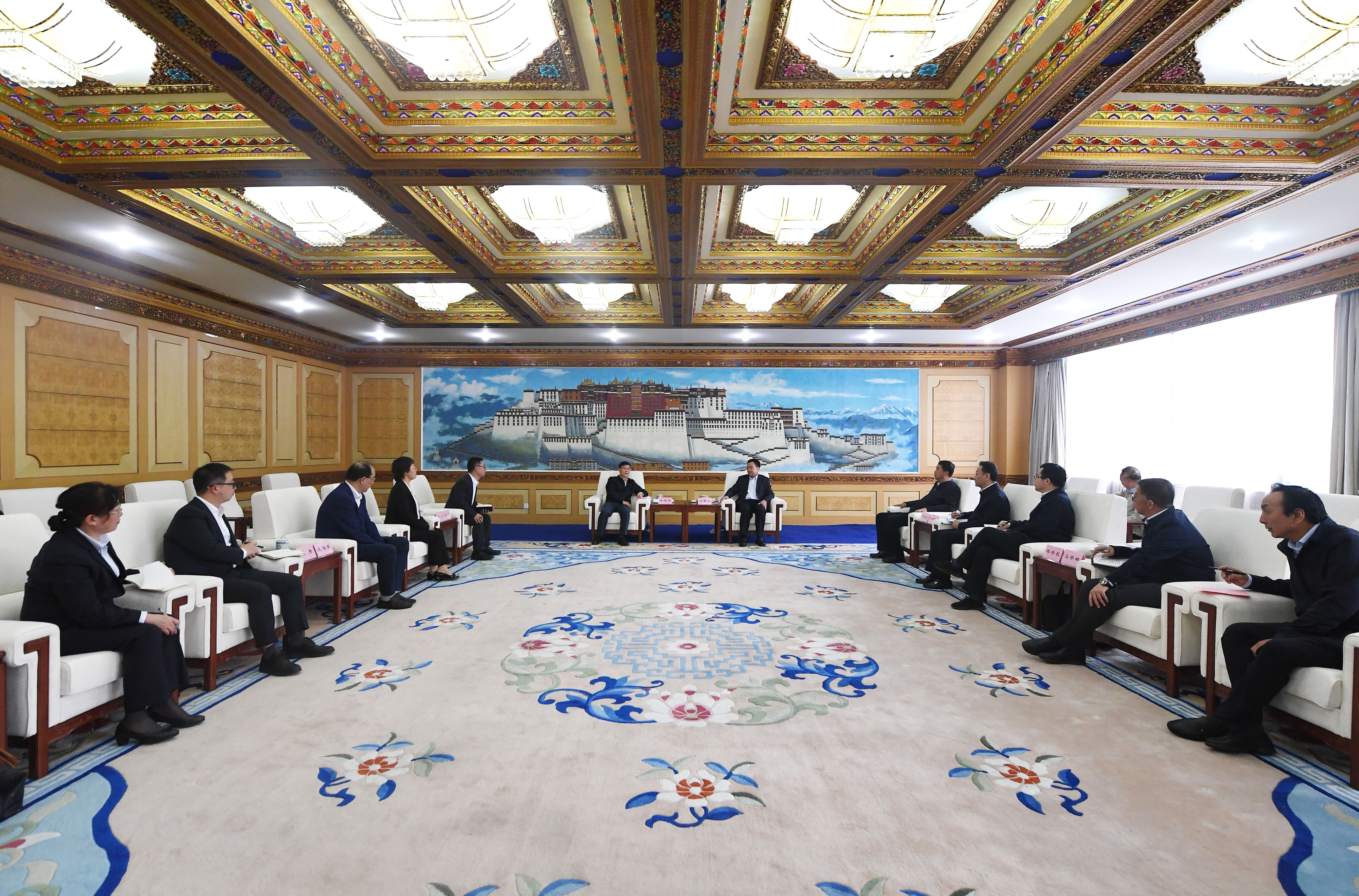 6月14日下午,自治区党委书记王君正与交通银行党委书记、董事长任德奇一行座谈,并共同见证西藏自治区与交通银行签署全面战略合作框架协议。这是座谈现场。记者 李洲 摄