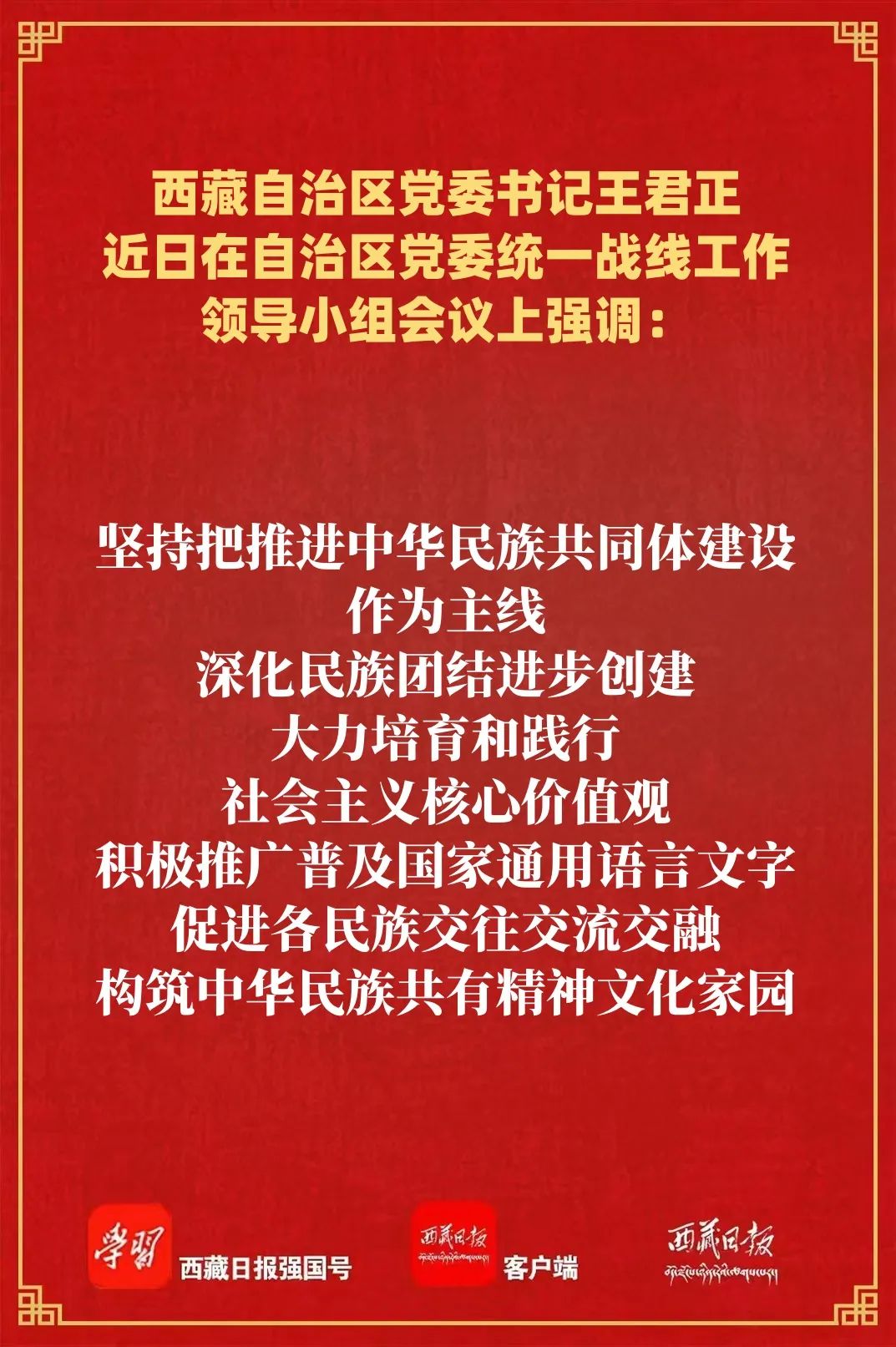 近日,自治区党委书记王君正主持召开自治区党委统一战线工作领导小组会议,传达学习中央有关会议精神,听取全区统战工作情况汇报,研究审议有关文件。强调,要深入学习贯彻习近平总书记关于做好新时代党的统一战线工作的重要思想、关于西藏工作的重要指示和新时代党的治藏方略,发扬优良传统,牢牢把握团结奋斗的时代要求,不断巩固和发展最广泛的爱国统一战线,为建设社会主义现代化新西藏凝心聚力。