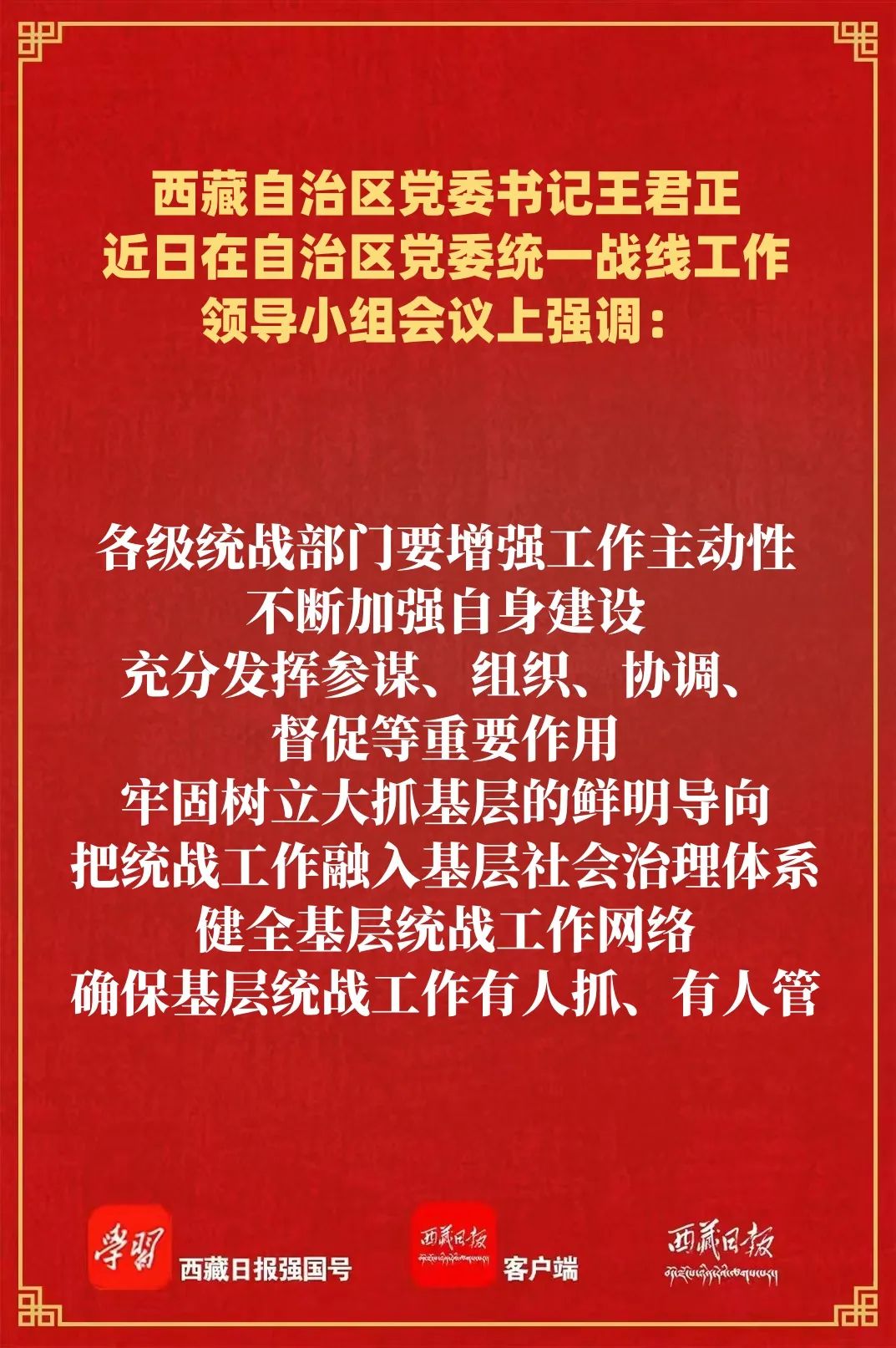 王君正强调,要加强党对统战工作的全面领导,为做好新时代统战工作提供坚强政治保证。各级党委要扛牢主体责任,坚持把统战工作纳入重要议事日程,定期研究重大问题、部署重要工作,进一步健全完善大统战工作格局。各级统战部门要增强工作主动性,不断加强自身建设,充分发挥参谋、组织、协调、督促等重要作用;牢固树立大抓基层的鲜明导向,把统战工作融入基层社会治理体系,健全基层统战工作网络,确保基层统战工作有人抓、有人管。建强统战干部队伍,锤炼党性修养、提升工作能力,改进作风、狠抓落实,以求真务实精神把各项工作一件一件落到实处,奋力推动新时代西藏统战工作高质量发展。