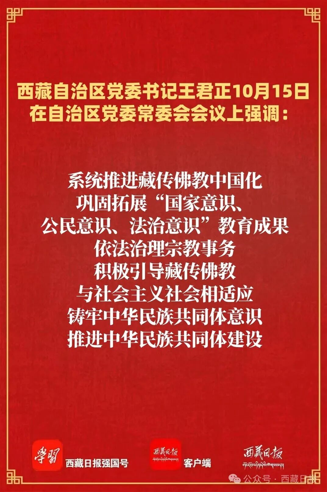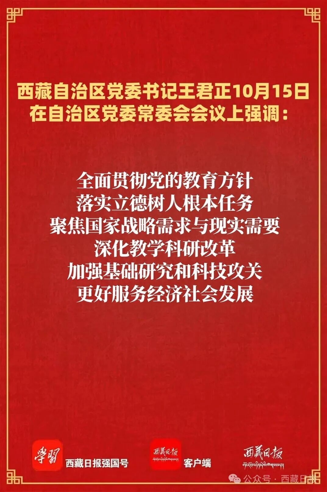 王君正强调,要弘扬理论联系实际的学风,坚持学以致用,努力把学习成果转化为推动西藏长治久安和高质量发展的强大动力。科学谋划“十五五”全区经济社会发展规划,牢牢把握“六个坚持”的重要原则,深化规律性认识,自觉把西藏工作置于党和国家工作大局中研究思考、谋划推动,扎实做好规划编制工作,为未来发展打下坚实基础。系统推进藏传佛教中国化,巩固拓展“国家意识、公民意识、法治意识”教育成果,依法治理宗教事务,积极引导藏传佛教与社会主义社会相适应,铸牢中华民族共同体意识,推进中华民族共同体建设。全面贯彻党的教育方针,落实立德树人根本任务,聚焦国家战略需求与现实需要,深化教学科研改革,加强基础研究和科技攻关,更好服务经济社会发展。推动全区妇女事业高质量发展,办好妇女可感可及的实事好事,加强技能培训,鼓励创业就业,充分发挥妇女在社会生活和家庭生活中的独特作用,在弘扬中华民族家庭美德、树立良好家风方面的独特作用,推进家庭家教家风建设,以小家庭的和谐共建大社会的和谐。加强组织领导,围绕稳定、发展、生态、强边四件大事,持续改进作风狠抓落实,扎实做好社会稳定、经济发展、民生保障等各项工作,继续做好定日县灾后重建民房入住工作,不断增强各族群众的获得感幸福感安全感,努力建设社会主义现代化新西藏。