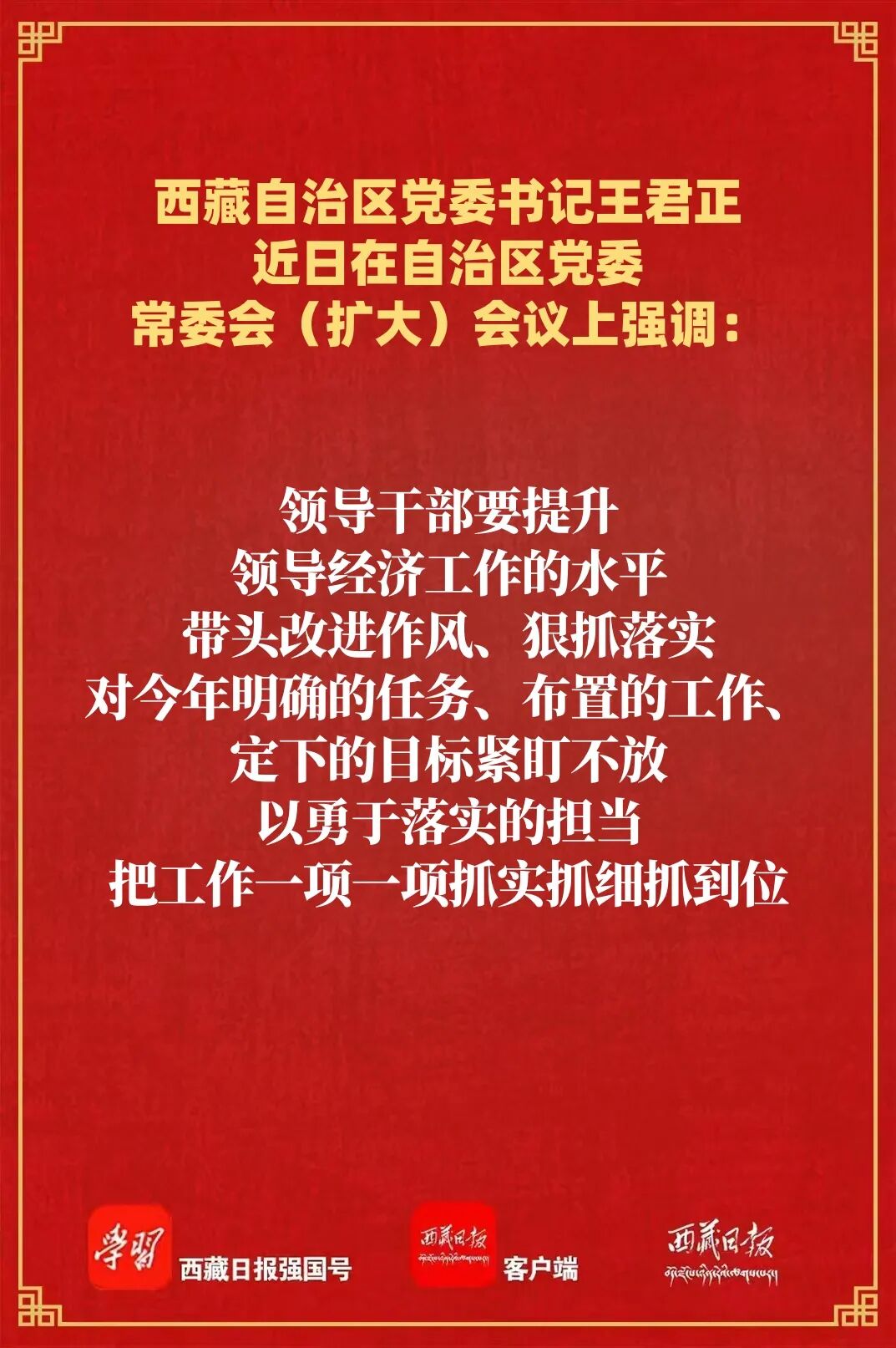 王君正强调,要加强对经济工作的领导,着力做好重点地区、重点行业、重点企业的工作。领导干部要提升领导经济工作的水平,带头改进作风、狠抓落实,对今年明确的任务、布置的工作、定下的目标紧盯不放,以勇于落实的担当,把工作一项一项抓实抓细抓到位。坚持典型引路,深化经验总结,激励真抓实干,持续营造良好社会氛围,推动党中央决策部署和自治区党委工作安排落到实处,为西藏长治久安和高质量发展奠定良好基础。(记者 张黎黎 张尚华)