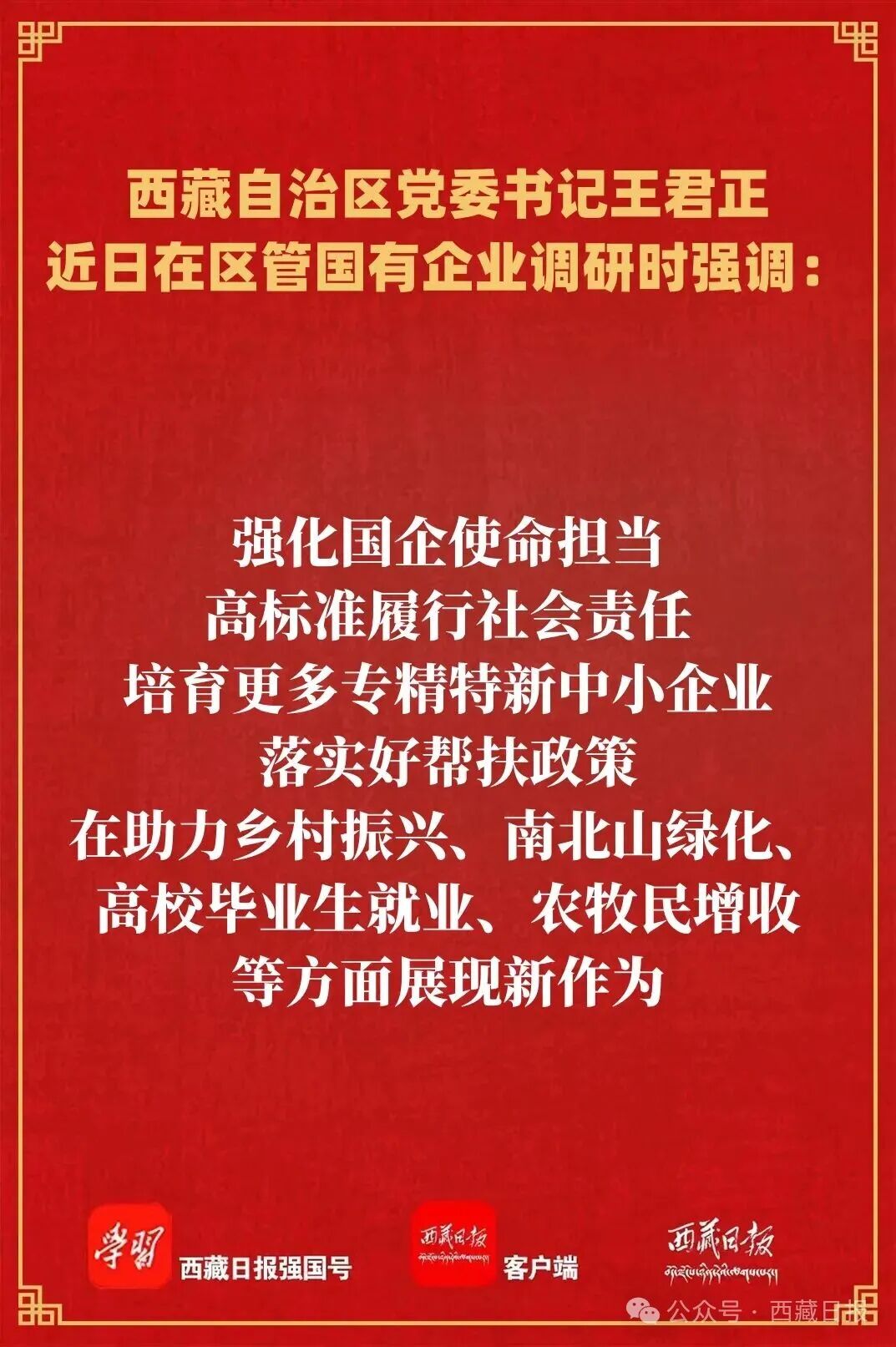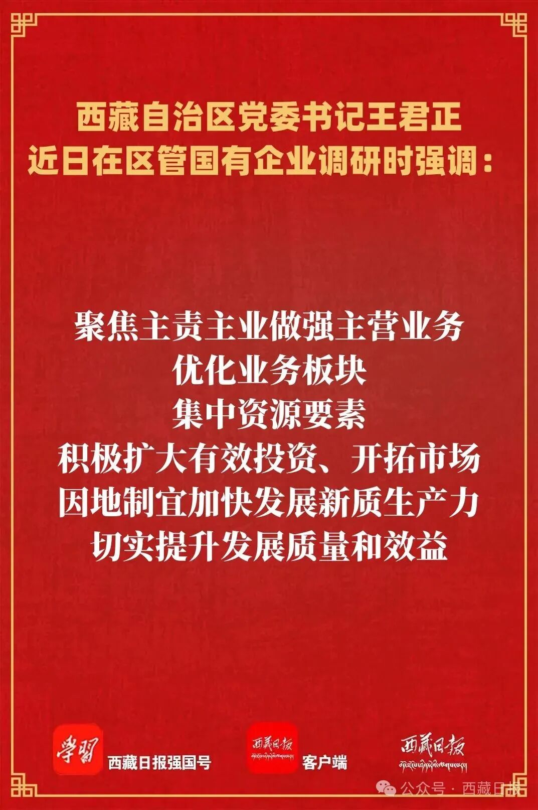 近日,自治区党委书记王君正在区管国有企业调研企业发展经营情况,强调要全面学习贯彻党的二十届四中全会精神,深入学习贯彻习近平经济思想,认真贯彻落实习近平总书记关于国有企业改革发展、西藏工作的重要指示和新时代党的治藏方略,科学谋划“十五五”国有企业改革发展工作,因地制宜加快发展新质生产力,不断提高国有企业发展质量和水平,为西藏长治久安和高质量发展作出新贡献。