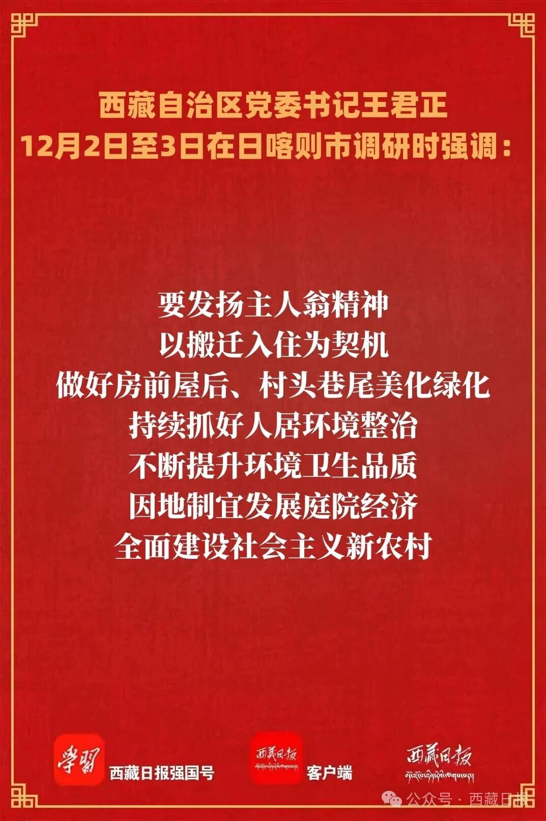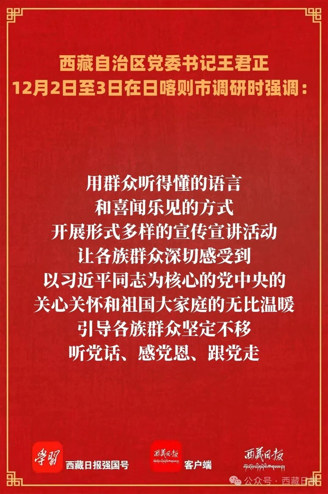 12月2日至3日,自治区党委书记王君正在日喀则市萨迦县、拉孜县调研,宣讲党的二十届四中全会精神和自治区党委十届九次全会精神。他强调,要深入学习贯彻党的二十届四中全会精神和自治区党委十届九次全会精神,全面贯彻落实习近平总书记关于西藏工作的重要指示和新时代党的治藏方略,扎实推进乡村全面振兴,持续巩固灾后恢复重建成果,全面建设社会主义新农村,不断增强各族群众的获得感幸福感安全感。