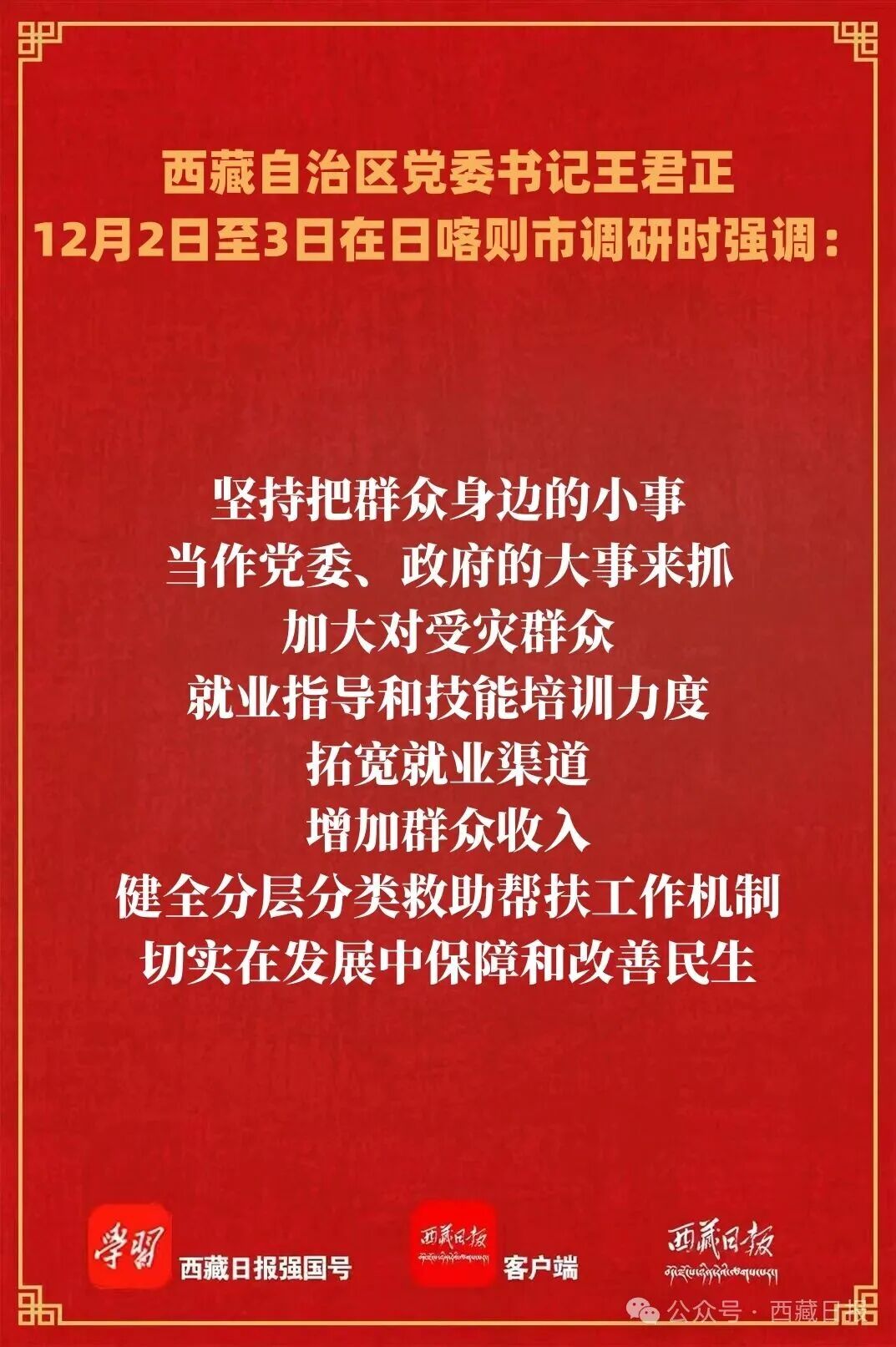 王君正强调,日喀则市和自治区有关部门要扎实推进乡村全面振兴,持续巩固灾后恢复重建成果,突出重点任务,注重整体推动,加强建成项目后续管理,认真谋划“十五五”时期灾区基础设施建设、产业发展和公共服务恢复提升工作,进一步增强各族群众的获得感幸福感安全感。加强思想政治引领,用群众听得懂的语言和喜闻乐见的方式,开展形式多样的宣传宣讲活动,让各族群众深切感受到以习近平同志为核心的党中央的关心关怀和祖国大家庭的无比温暖,引导各族群众坚定不移听党话、感党恩、跟党走。增强灾区发展能力,统筹灾后恢复重建和经济社会发展,聚焦灾区发展所需、群众所盼、未来所向,科学布局具有当地特色、符合长远发展的产业,不断提高群众生产生活水平。用心用情解决群众急难愁盼问题,坚持把群众身边的小事当作党委、政府的大事来抓,加大对受灾群众就业指导和技能培训力度,拓宽就业渠道,增加群众收入,健全分层分类救助帮扶工作机制,切实在发展中保障和改善民生。