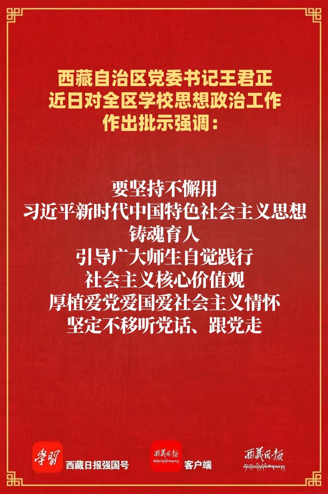 王君正指出,党的十八大以来,全区教育系统深入学习贯彻习近平新时代中国特色社会主义思想,全面贯彻党的教育方针,落实立德树人根本任务,持续加强和改进学校思想政治工作,为推进西藏长治久安和高质量发展作出了积极贡献。