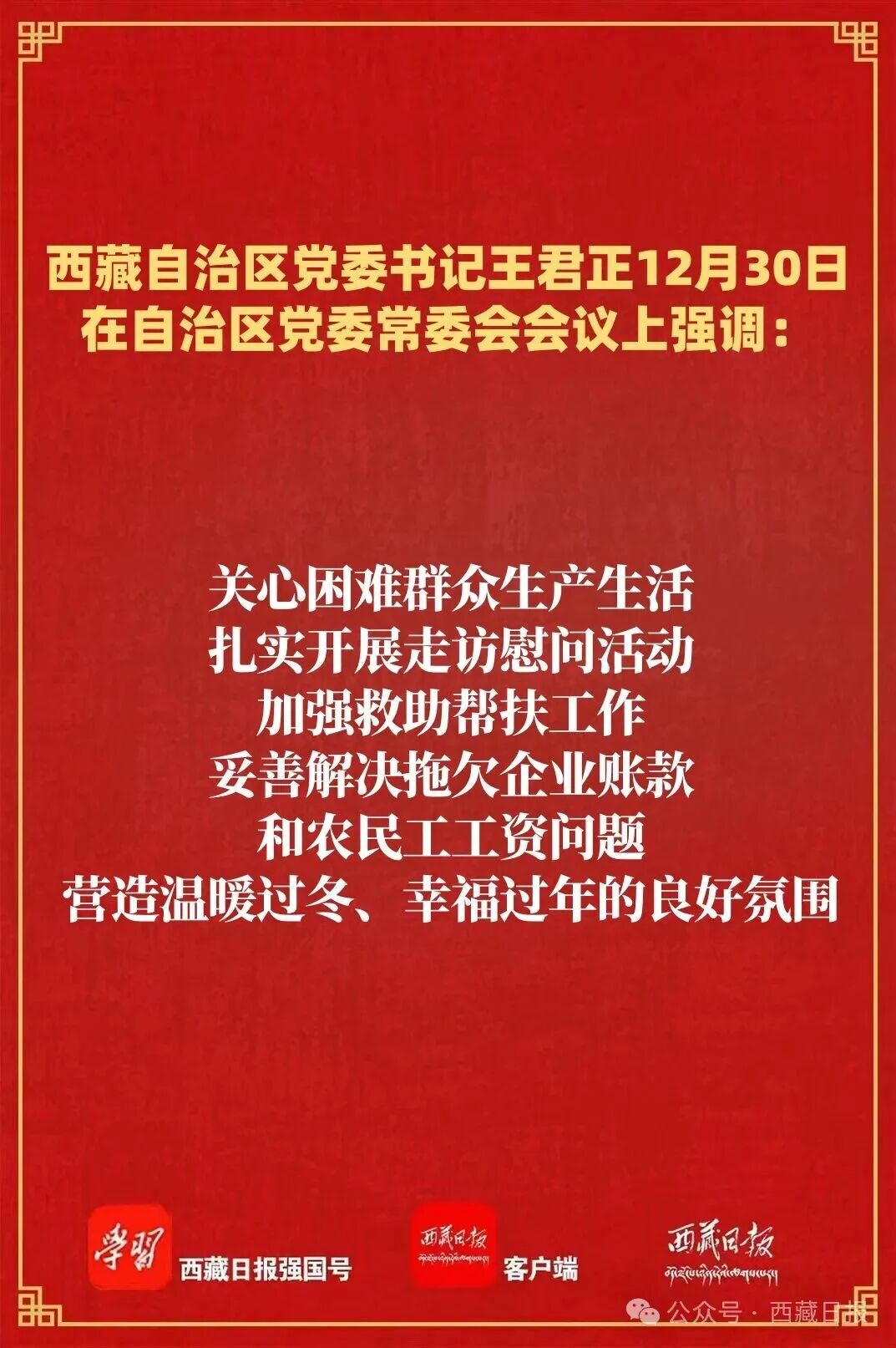 王君正强调,新年将至,要统筹做好岁末年初各项工作,切实增强各族群众的获得感幸福感安全感。关心困难群众生产生活,扎实开展走访慰问活动,加强救助帮扶工作,妥善解决拖欠企业账款和农民工工资问题,营造温暖过冬、幸福过年的良好氛围。扩大优质商品和服务供给,创新多元消费场景,激发假期消费潜力,确保市场供应充足、价格稳定;丰富文体活动、打造文艺精品,持续丰富群众精神文化生活。巩固拓展深入贯彻中央八项规定精神学习教育成果,弘扬中华民族优良传统,倡导勤俭节约、简朴过节,保持定力、寸步不让,确保节日期间风清气正。树牢底线思维和风险意识,提升应急管理能力,强化应急预案演练,做好各类突发事件应急处置准备,确保社会大局持续和谐稳定。
