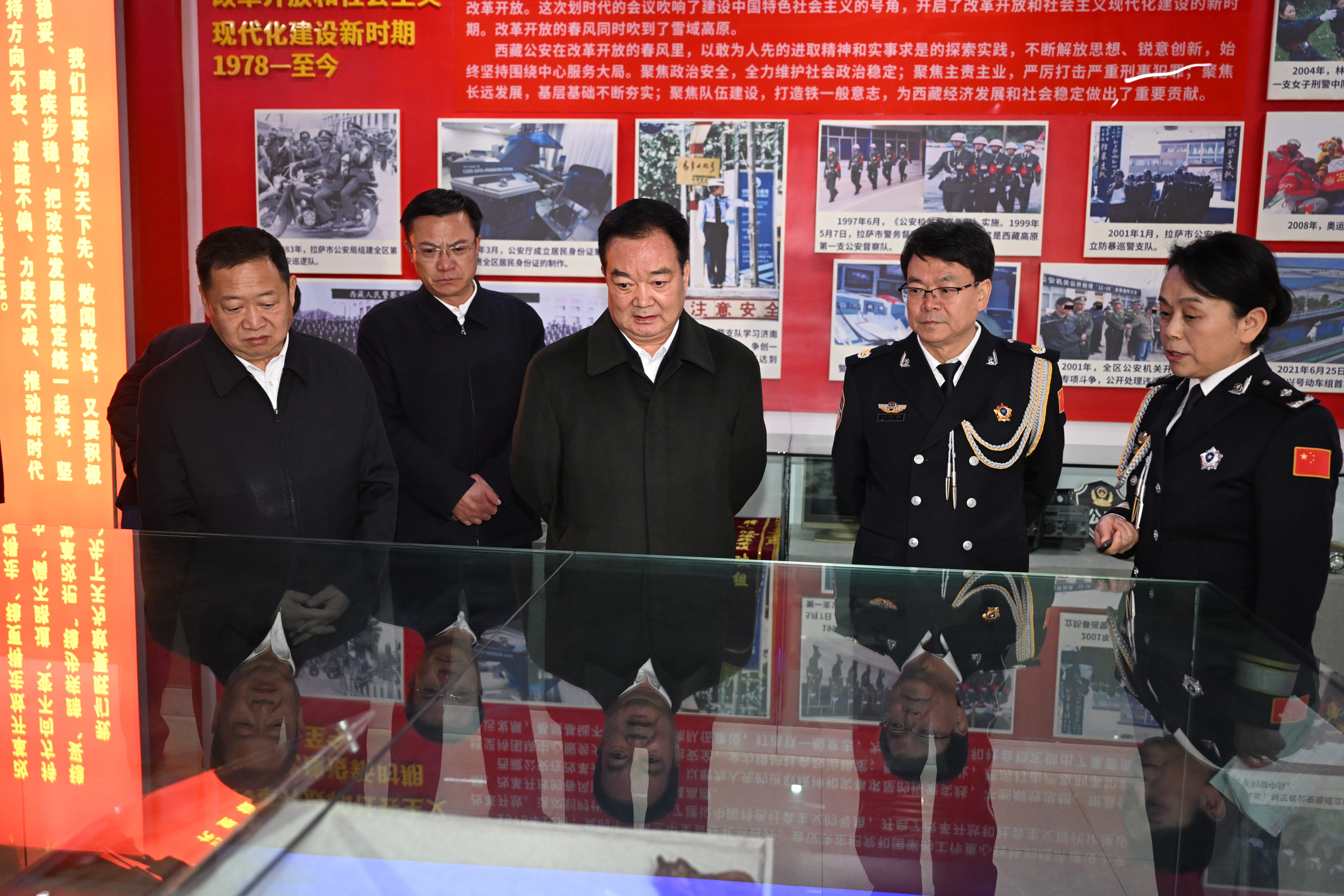 近日,自治区党委书记王君正来到自治区公安厅看望公安民辅警。这是王君正在警史馆里认真听取讲解,详细了解有关情况。记者 旦增西旦 摄