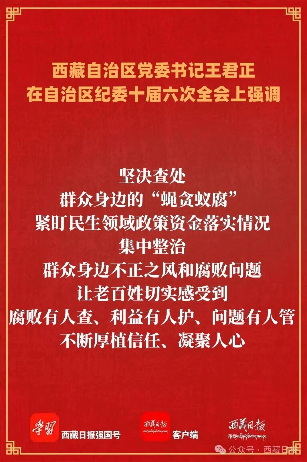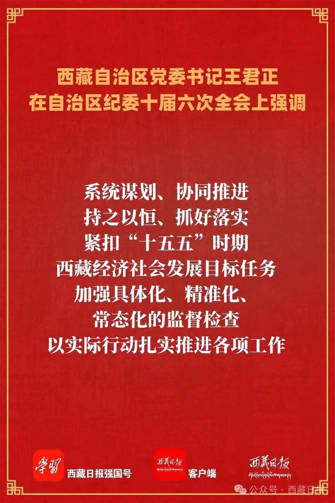 1月16日至17日,自治区纪委十届六次全会在拉萨召开。自治区党委书记王君正出席并讲话。他强调,要认真学习贯彻习近平总书记关于党的建设的重要思想、关于党的自我革命的重要思想,深入贯彻落实二十届中央纪委五次全会精神特别是习近平总书记重要讲话精神,以更高标准、更实举措推进全面从严治党和反腐败斗争,努力营造风清气正的政治生态,为实现“十五五”时期目标任务、建设社会主义现代化新西藏提供坚强保障。