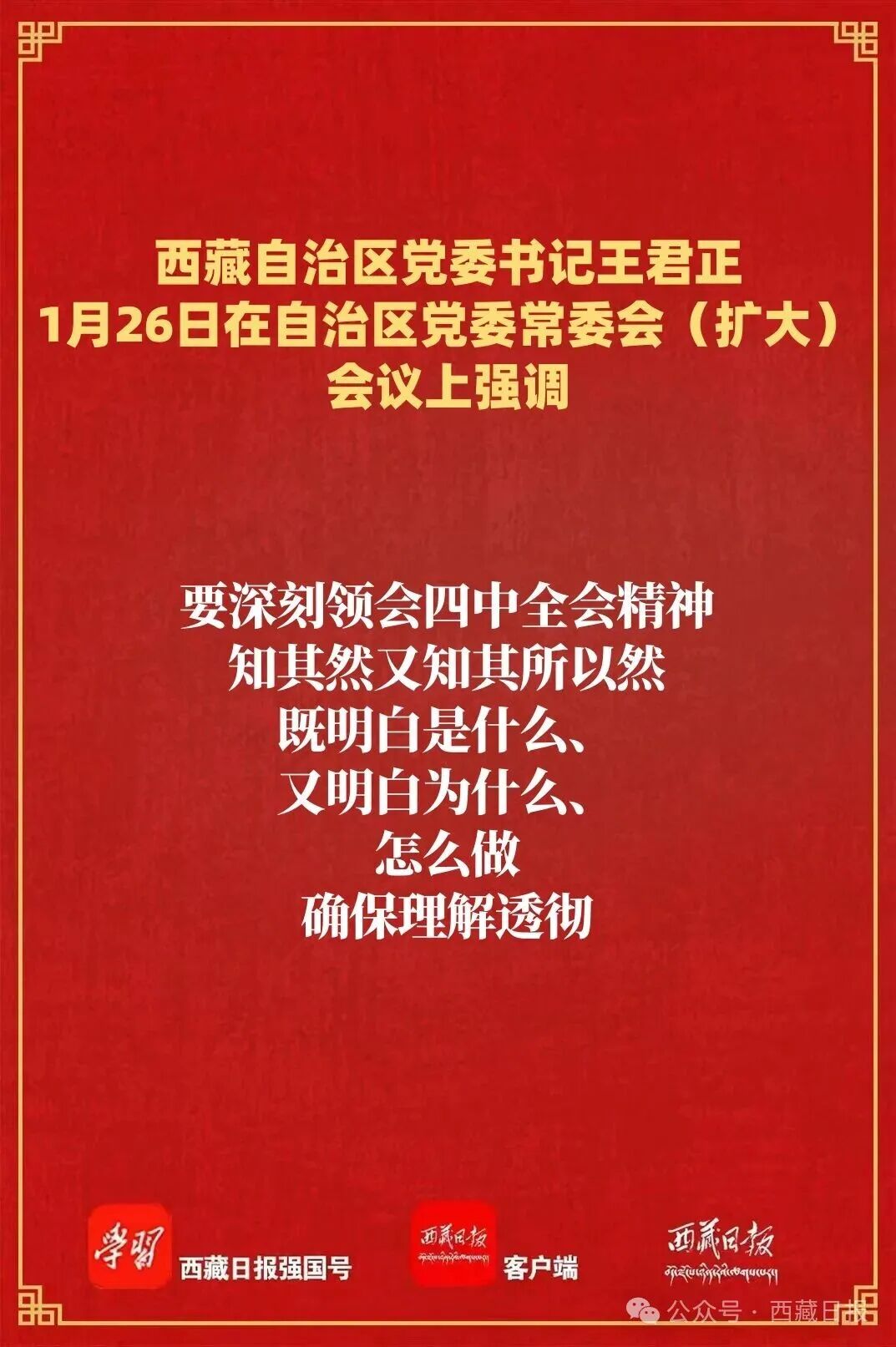 1月26日,自治区党委书记王君正主持召开自治区党委常委会(扩大)会议,认真传达学习习近平总书记在省部级主要领导干部学习贯彻党的二十届四中全会精神专题研讨班开班式上的重要讲话精神。强调,要深入学习习近平总书记重要讲话精神,全面深刻准确领会和把握党的二十届四中全会精神,持之以恒抓好稳定、发展、生态、强边四件大事落实,确保“十五五”开好局、起好步,为社会主义现代化新西藏建设打下坚实基础。