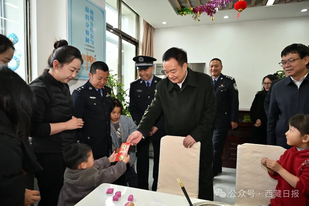 双节同庆,雪域高原处处洋溢着欢乐、祥和的喜庆气氛。王君正来到南伊边境派出所,看望慰问坚守岗位的值班政法干警,通过视频连线听取春节、藏历新年期间全区维稳工作汇报,现场随机调度值班值守和信息化平台运行情况。王君正指出,社会治理体系和治理能力现代化水平要在基层得到全面落实,推动基层治理重心下移、力量下沉,强化风险预测预警预防,加强科技赋能,加快信息化建设,提高基层治理社会化、法治化、智能化、专业化水平,进一步夯实长治久安和高质量发展的基础。派出所里挂满了大红的福字、喜庆的春联,从五湖四海前来相聚的民警家属正在准备丰盛的开年饭,王君正祝福大家新年快乐,并向家属对民警工作的大力支持表示衷心感谢。他说,春节、藏历新年是阖家团聚、辞旧迎新的重要节日。节日期间大家依然坚守岗位,用个人的默默付出有力守护了万家团圆,充分彰显了优良作风和使命担当。