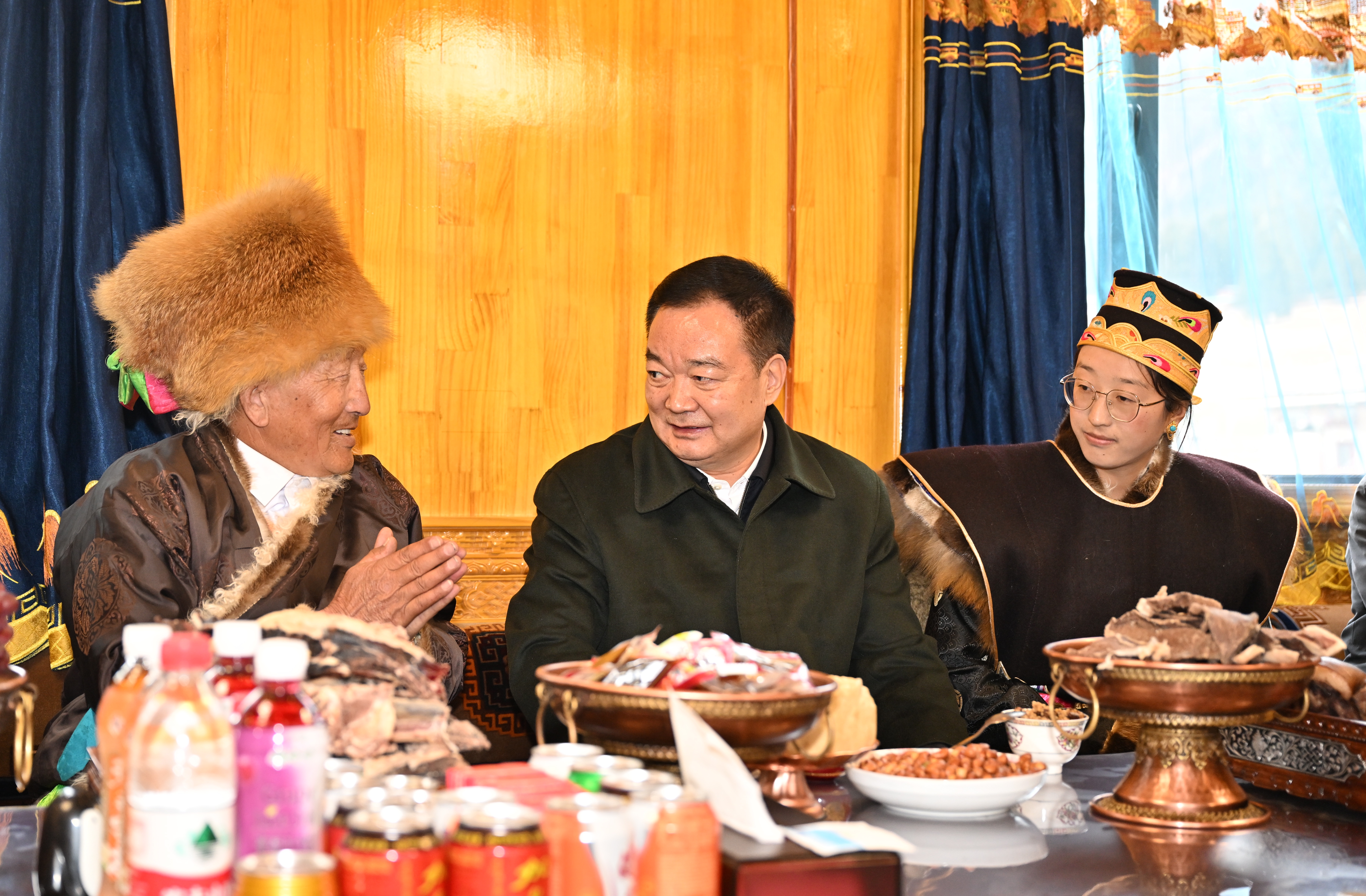 2月19日,自治区党委书记王君正前往巴宜区,看望慰问基层群众和党员干部,与各族干部群众一起欢度新年。这是王君正在鲁朗镇扎西岗村77岁的老党员、致富带头人平措家里聊家常、庆新年。记者 旦增西旦 摄
