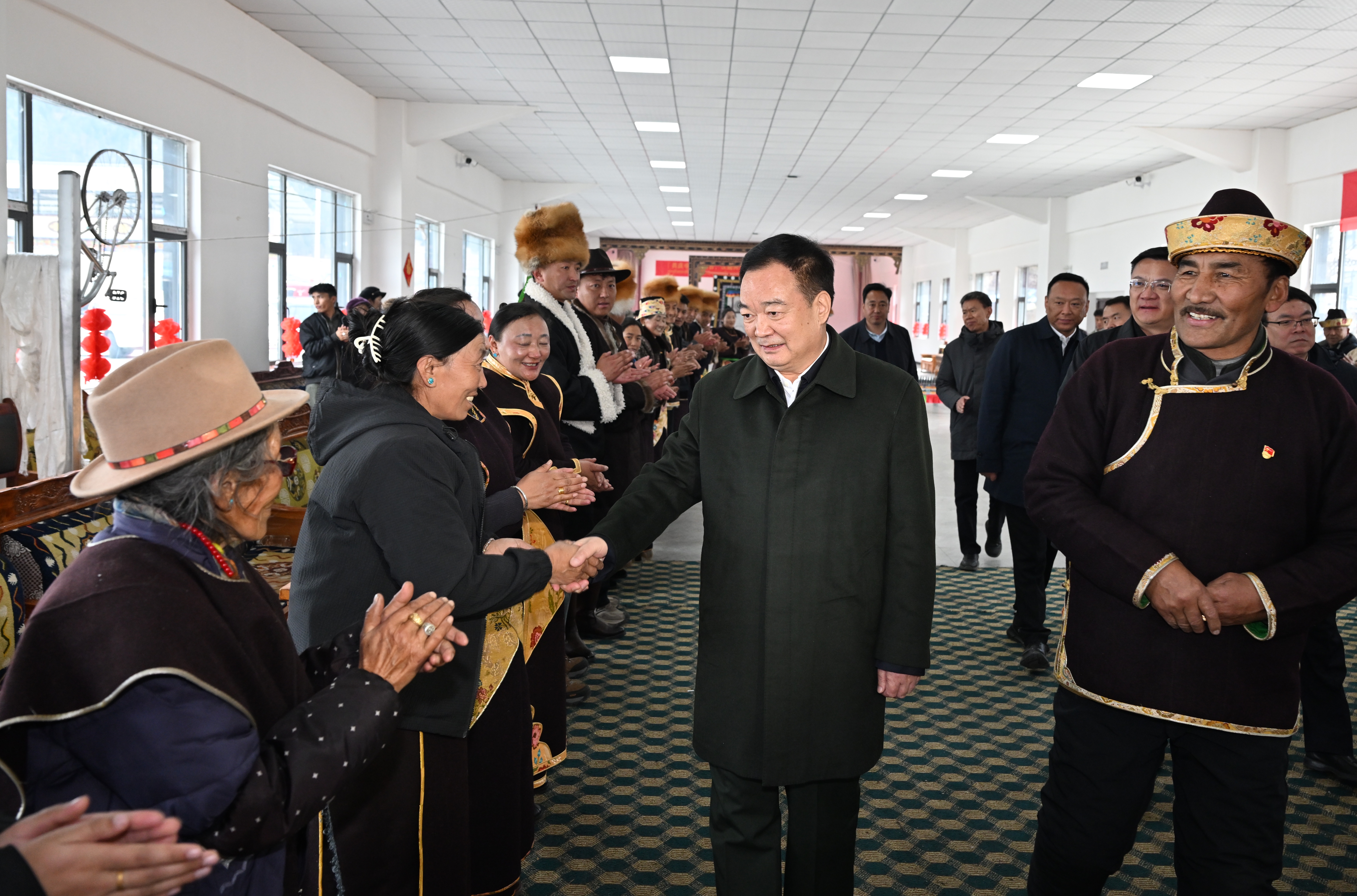 2月19日,自治区党委书记王君正前往巴宜区,看望慰问基层群众和党员干部,与各族干部群众一起欢度新年。这是王君正在扎西岗村党群活动中心和乡亲们一一握手,亲切交谈。记者 旦增西旦 摄