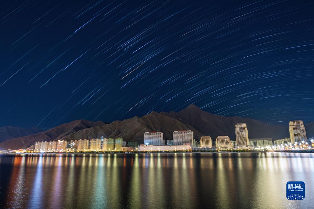 西藏拉萨市夜晚星空璀璨,清澄的天空与城市灯光相得益彰。