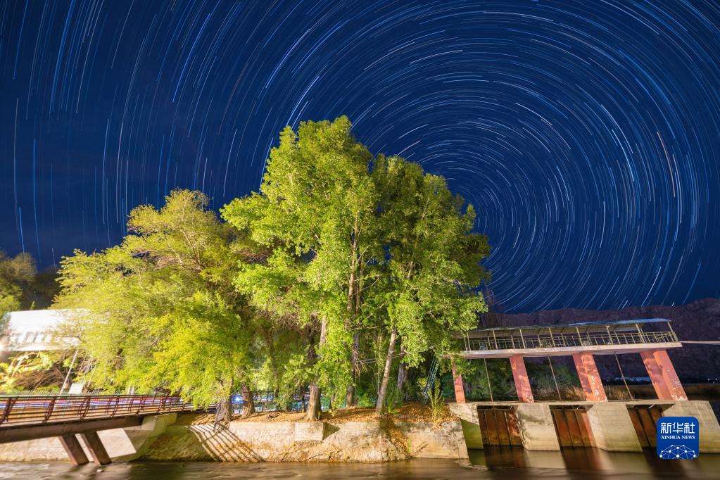 5月4日在拉萨河畔拍摄的星轨(合成照片)。新华社记者 周荻潇 摄
