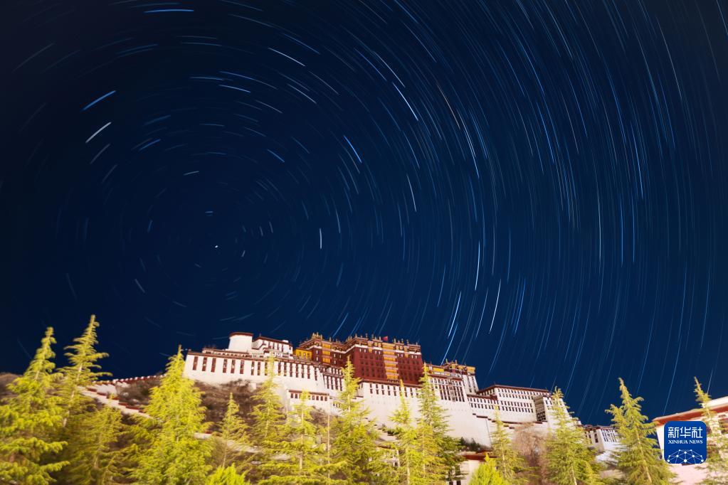 5月4日在拉萨市布达拉宫前拍摄的星轨(合成照片)。新华社记者 周荻潇 摄