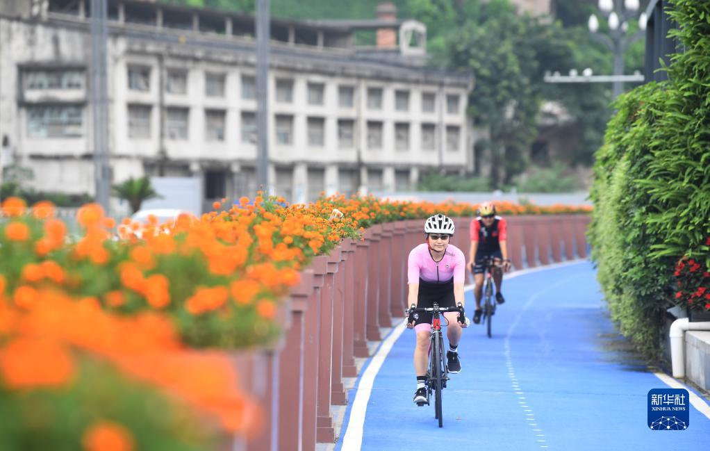 (市民在重庆市江北区北滨路漫行步道的自行车道上骑行)