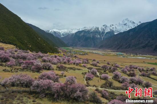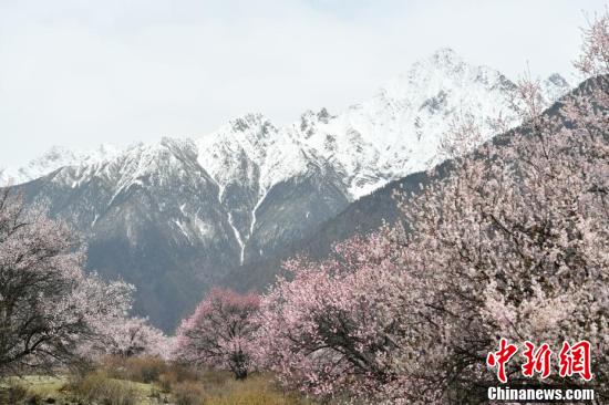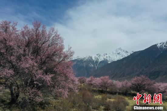 当地农牧民靠着“桃花旅游”增收。这里紧邻国家森林公园、国家5A级旅游景区巴松措,是很多游客必打卡之地。图为桃花盛放,远处雪山映照。