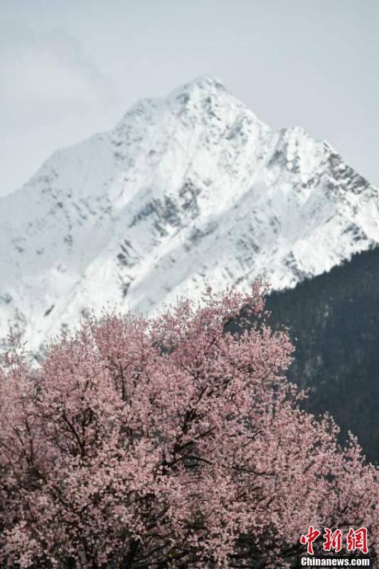 林芝桃花节最负盛名,已举办20届,各地桃花花期相继从3月底一直至4月中旬,吸引着来自五湖四海的游客。图为桃花盛放,远处雪山映照。