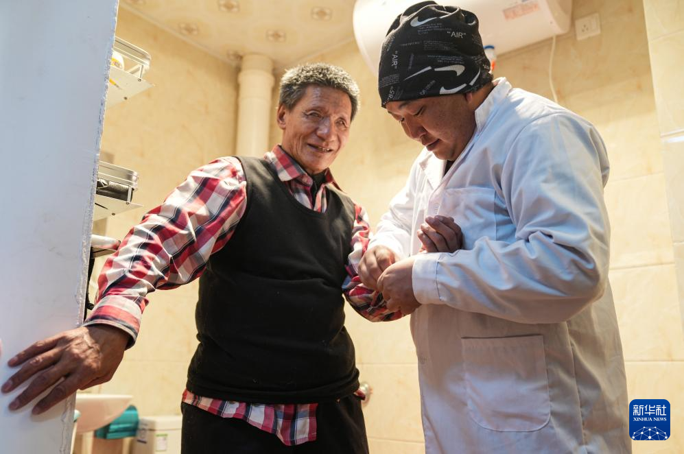 服务中心工作人员在帮助失明老人洗漱(1月30日摄)。新华社记者 晋美多吉 摄