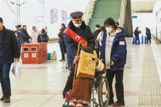 图为拉萨车站“天路格桑花”青年志愿服务队工作人员为旅客服务。 孙皓 记者 丹增群培 摄