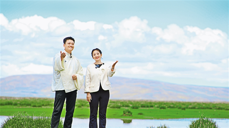 图为色尼区文化和旅游局副局长塔巴曲珍(右)与歌手罗布桑珠录制宣传视频。记者 万靖 摄