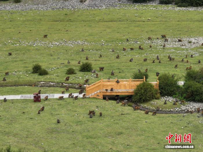 图为林则村的林则生态文化旅游景区里的藏猕猴。(无人机照片)中新社记者 贡嘎来松 摄