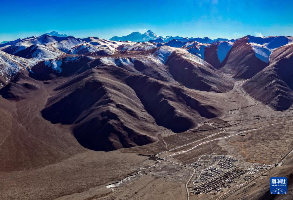 珠穆朗玛峰脚下的西藏定日县措果乡野江村,靠近珠峰方向为建成并交付群众使用的新房(11月12日摄,无人机照片)。新华社记者 姜帆 摄