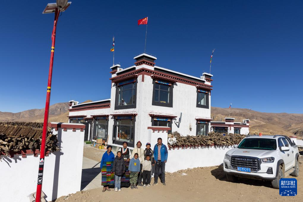 西藏定日县曲洛乡措昂村村民达瓦卓玛(后中)一家在新房前准备拍摄“全家福”(10月27日摄)。新华社发(陈小军摄)