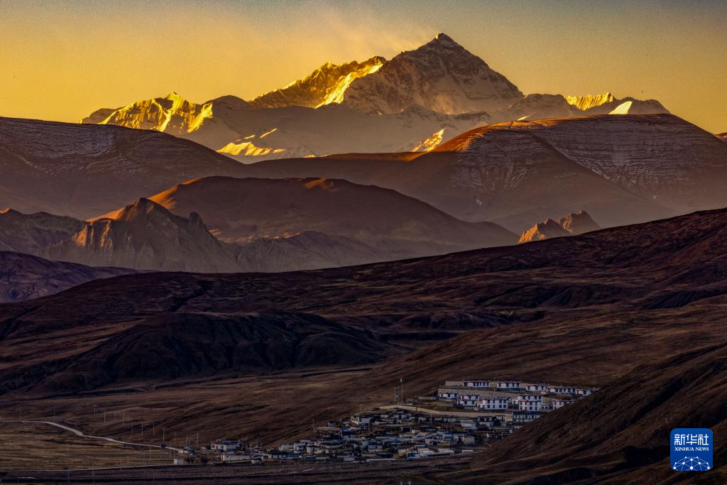 日出时分拍摄的西藏定日县协格尔镇查那村,村中地势较高处为建成并交付使用的新房(11月13日摄)。新华社记者 姜帆 摄