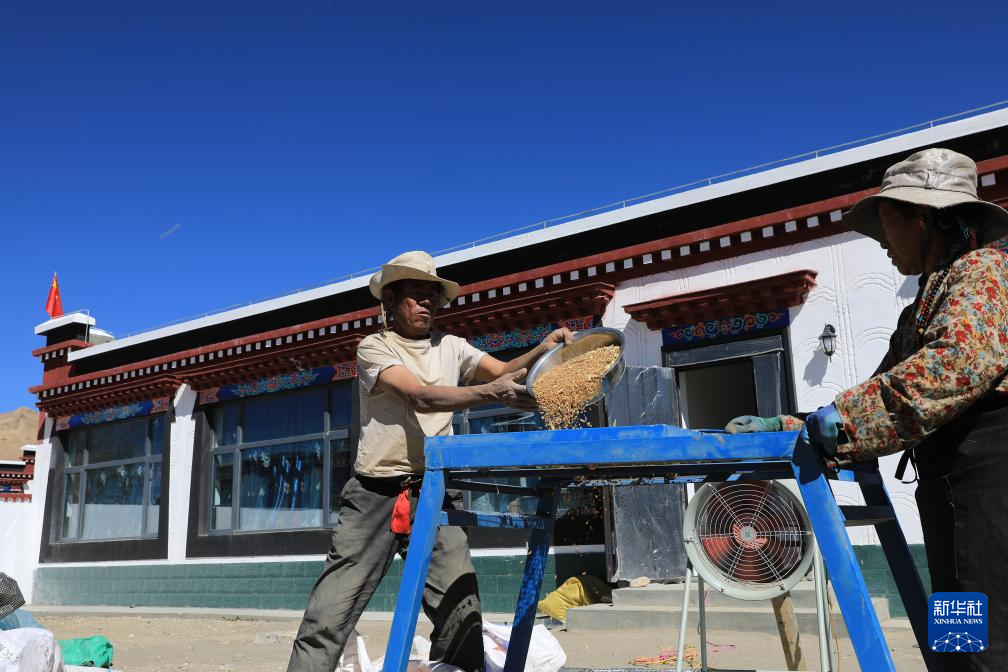 西藏定日县曲洛乡措昂村村民旦增(左)在自家新房院子里加工收获的青稞(10月24日摄)。新华社发(陈小军摄)