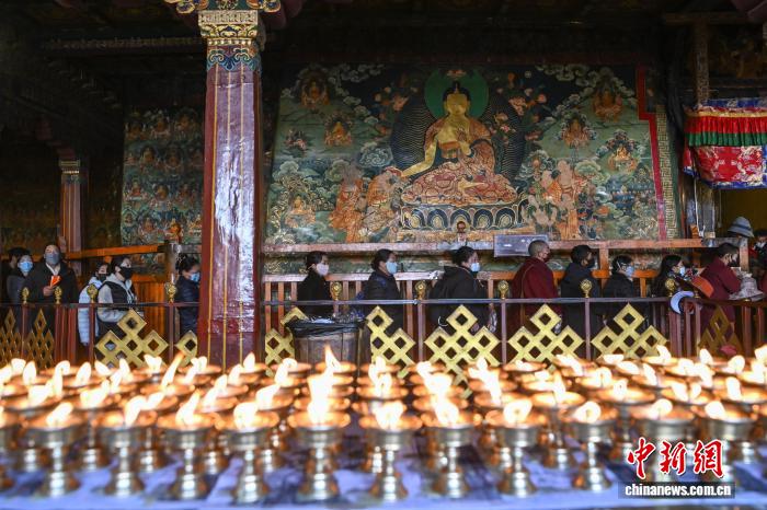 11月28日,西藏拉萨,信众在大昭寺里排队朝拜。西藏进入冬季农闲期,众多藏传佛教信众从各地汇聚到拉萨,围绕林廓转经路、大昭寺等地转经、礼佛、朝拜。中新社记者 贡嘎来松 摄