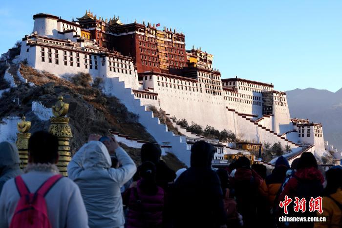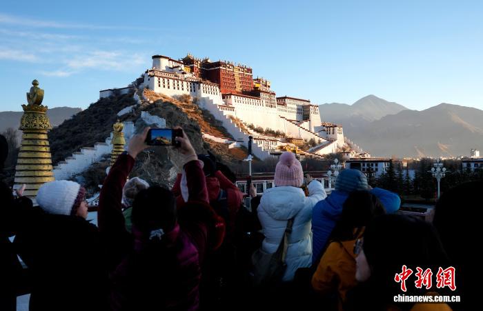 2026年1月1日,游客在西藏拉萨药王山观景台拍摄布达拉宫日出,迎接新年第一缕阳光。中新社记者 李林 摄