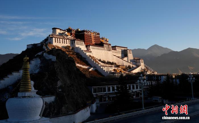 2026年1月1日,西藏拉萨药王山观景台拍摄的布达拉宫日出。中新社记者 李林 摄