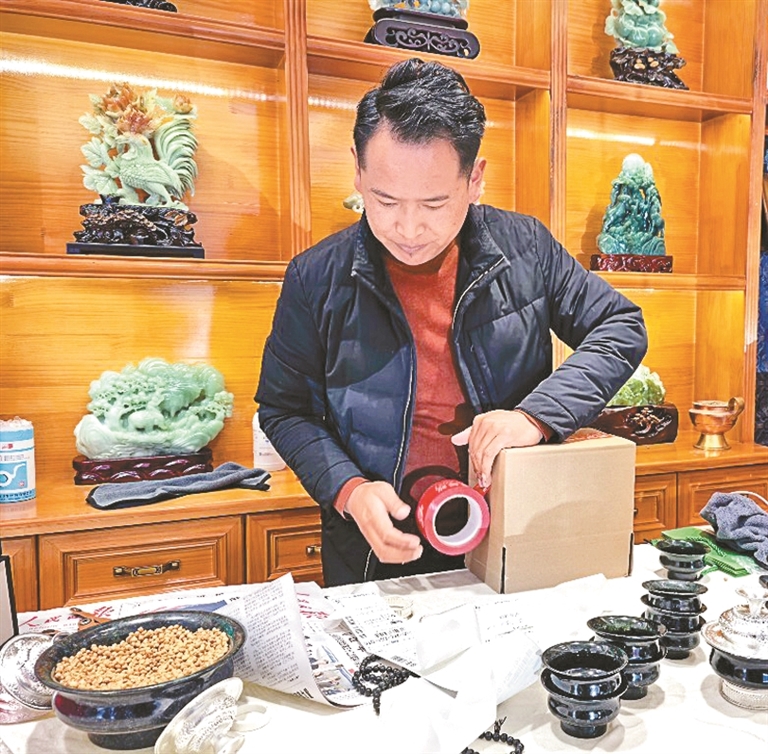 图为销售负责人曲朗在对玉石碗打包装箱。记者 扎西顿珠 摄