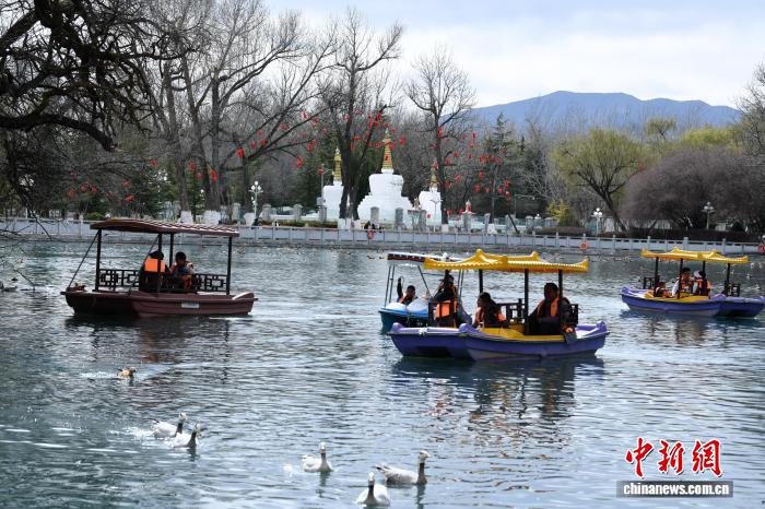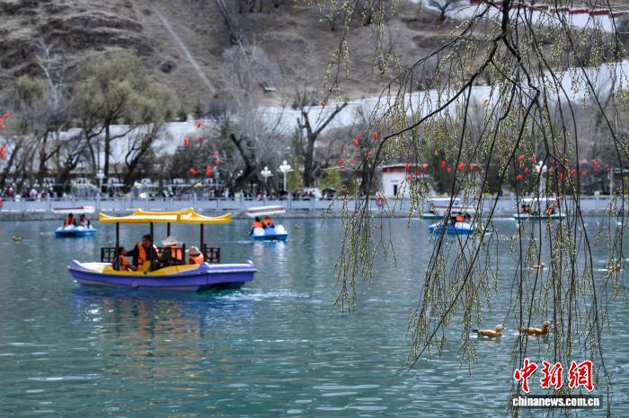 3月8日,西藏拉萨宗角禄康公园,市民乘游船赏春。阳春三月,古城拉萨杨柳发芽、桃花初放,春意渐浓。中新社记者 贡嘎来松 摄
