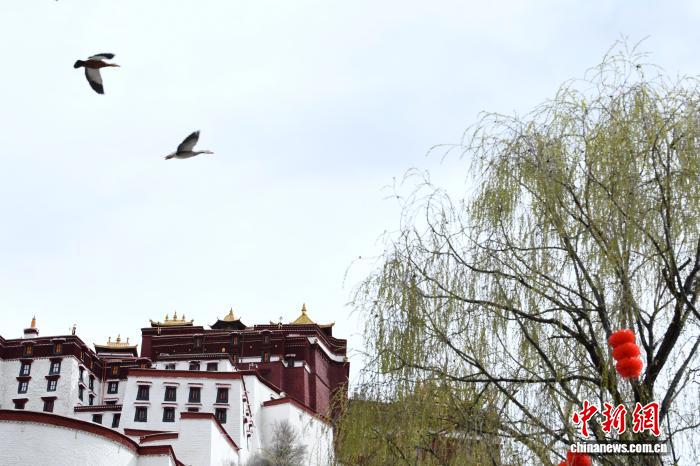 3月8日,西藏拉萨宗角禄康公园,杨柳吐绿。阳春三月,古城拉萨桃花初放、生机盎然,春意渐浓。中新社记者 贡嘎来松 摄