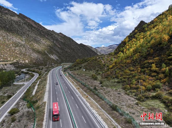 10月1日,西藏自治区林芝工布江达县秋色渐浓,拉萨至林芝的高等级公路沿线成“移动画廊”。