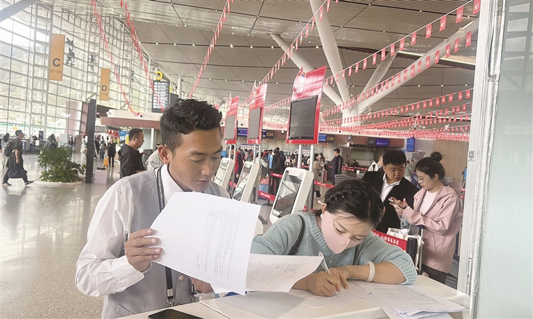 祥鹏航空地服工作人员协助万女士办理宠物进客舱相关乘机手续。旅客如需了解更多服务细则,可通过祥鹏航空官方网站或客服热线进行查询。