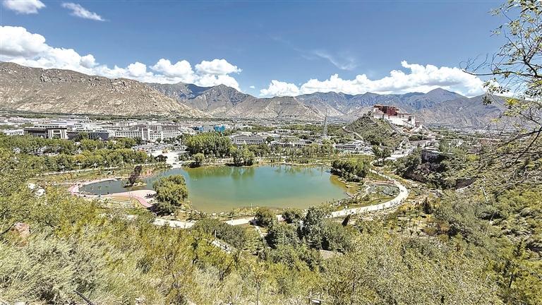 步入拉萨团结公园,湖光潋滟、绿树成荫。沿步行道往药王山拾阶而上,远眺布达拉宫,美丽壮观。