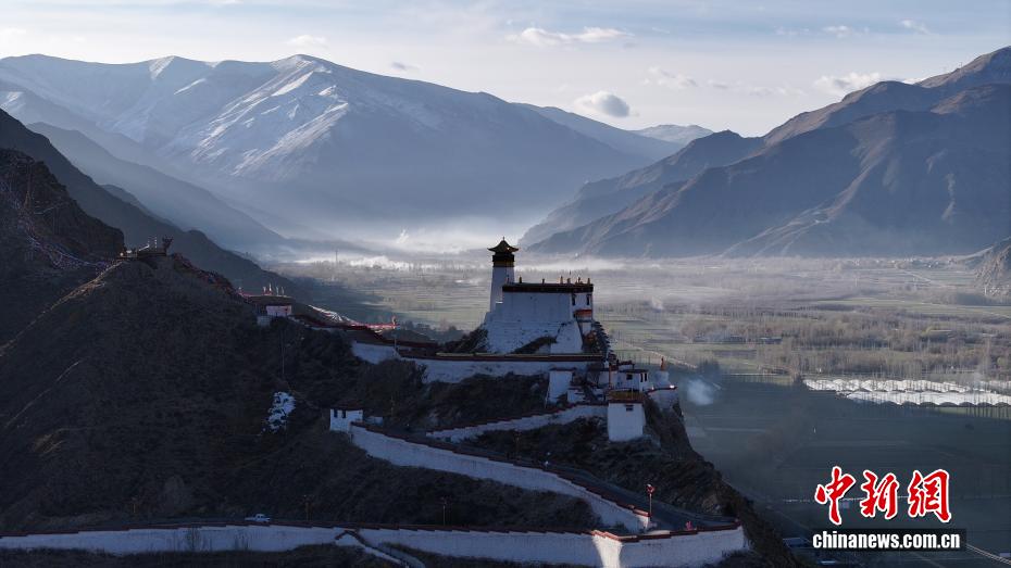 3月16日清晨,西藏山南市雍布拉康迎来日出,金色晨光洒向西藏第一座宫殿,古建与山峦相映成画,壮美静谧,尽显藏源山南独特景致。