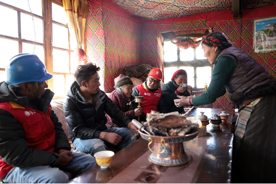 帐篷里大家围坐在一起,喝着热气腾腾的酥油茶,热情的让卓不停地向服务队队员献上脆脆的风干肉,有说有笑。让卓85岁的老奶奶玛姆也凑起热闹聊家常,即使听力有些下降,但聊到用电给生活带来的改变时,老奶奶笑着用流利的藏语说“党的政策好啊!”