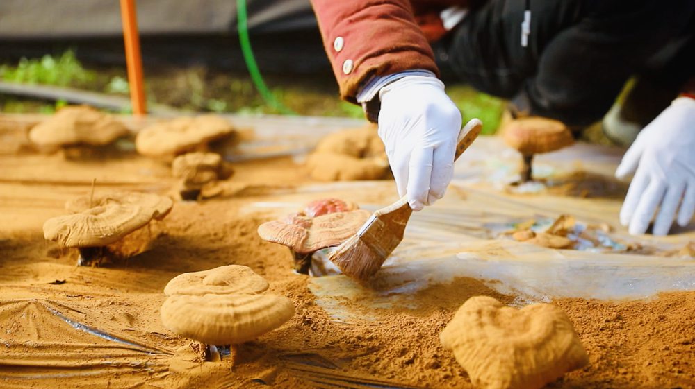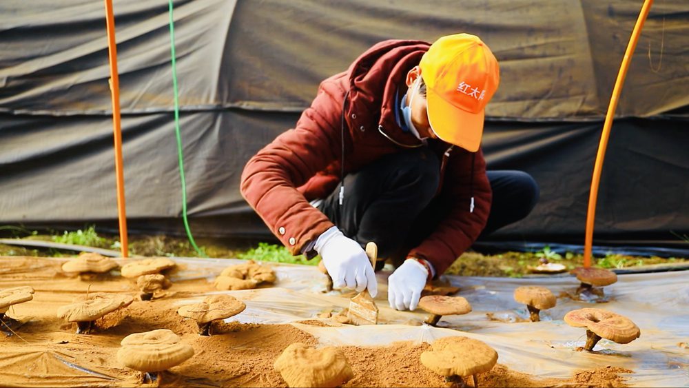 走进灵芝种植大棚,看到一株株大小各异、形态万千、灵动娇俏的灵芝,长势喜人。工作人员正将采摘下来的灵芝,拿着刷子轻轻扫下灵芝表面的孢子粉进行收集,一些成熟的孢子粉掉落后布满地下的塑料膜。放眼望去,一片纯正的咖啡色,散发着浓浓的药香,更展示着一条新的坚实的致富之路。