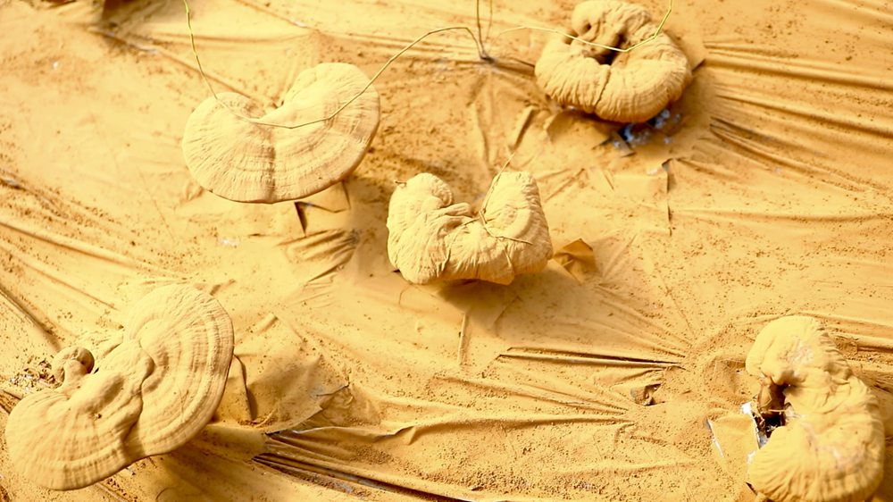 灵芝基地内孢子粉布满塑料膜。