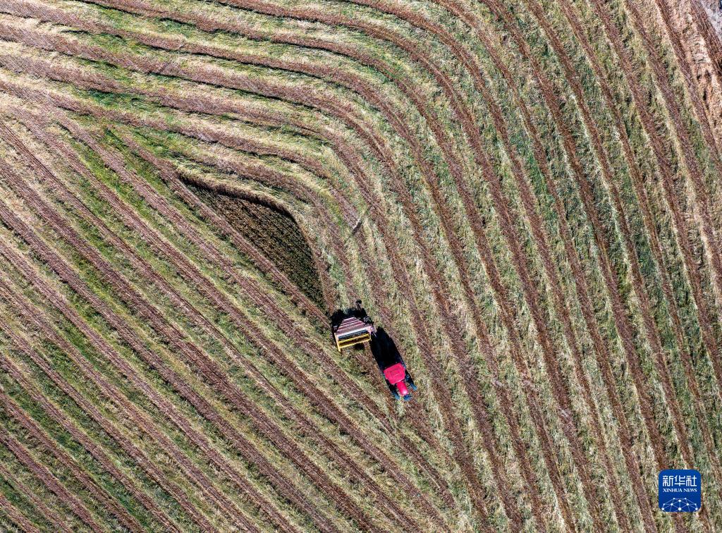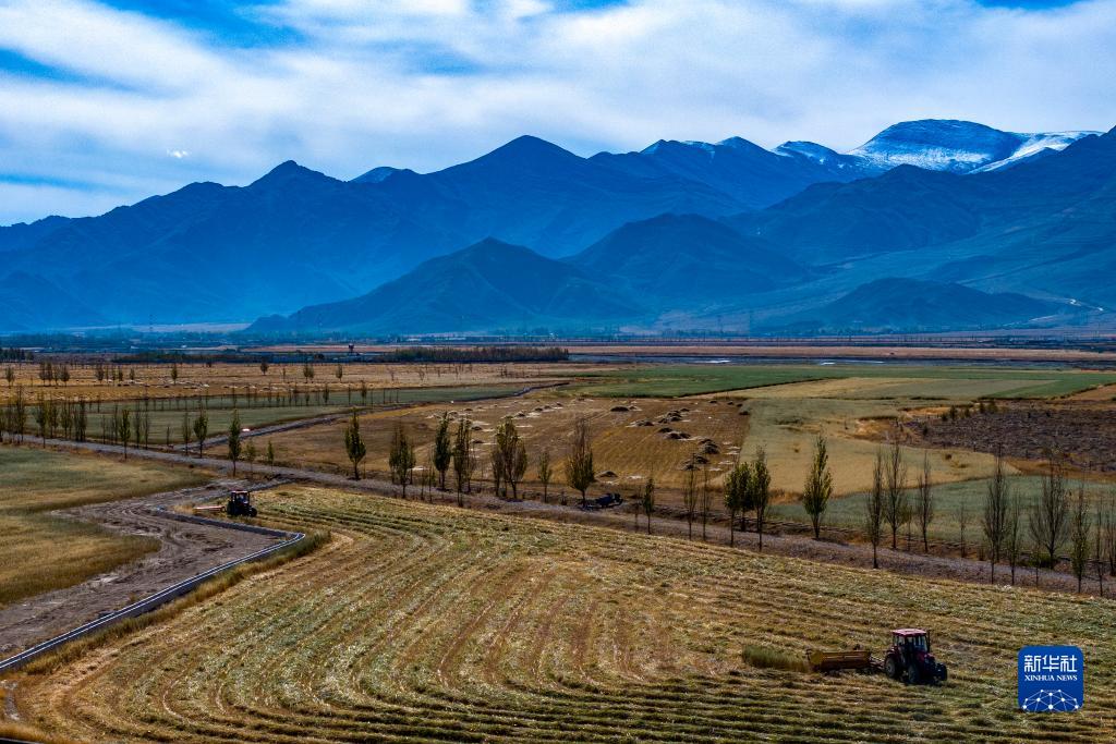 10月24日,村民驾驶农机在拉萨市林周县强嘎乡曲嘎强村收割牧草(无人机照片)。新华社记者 姜帆 摄
