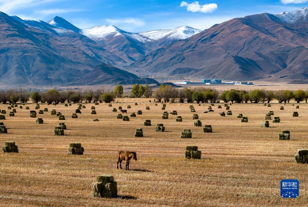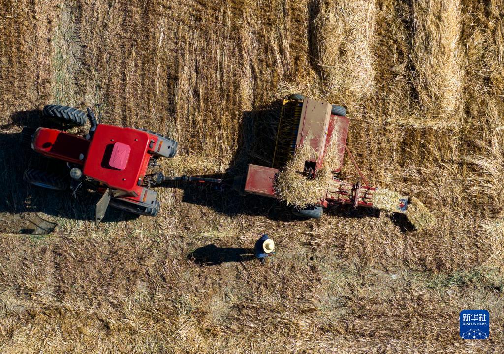 10月24日,村民驾驶农机在拉萨市林周县强嘎乡曲嘎强村将收割过的牧草打包(无人机照片)。新华社记者 姜帆 摄