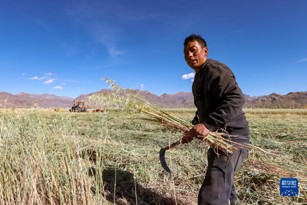 10月24日,拉萨市林周县强嘎乡曲嘎强村村民阿旺旦增在自家田垄边收割牧草。