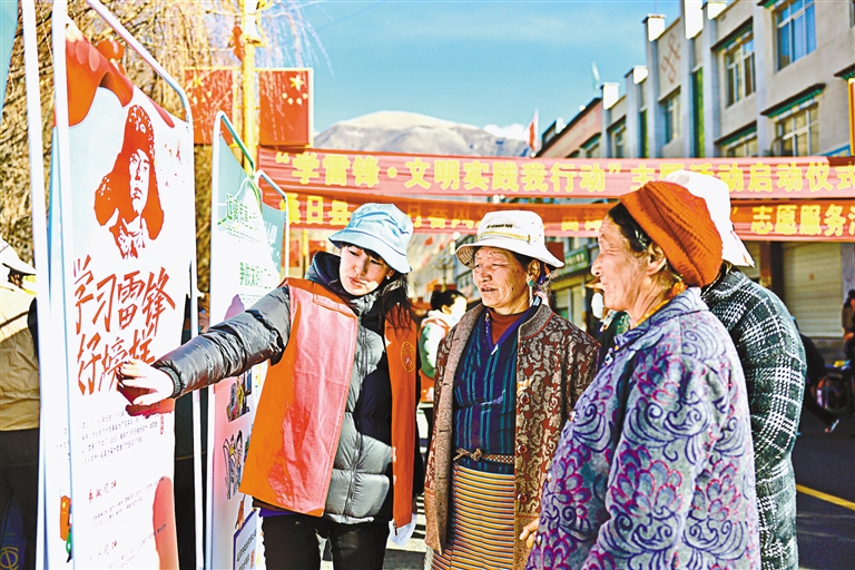 图为在桑日县“学雷锋·文明实践我行动”主题活动启动仪式现场,志愿者向过往群众讲解雷锋精神。