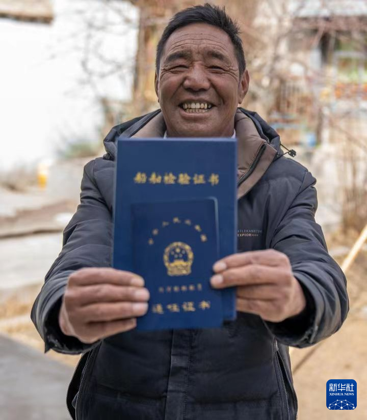 索朗扎西展示自己的船舶检验证书(2月23日摄)。新华社记者旦增尼玛曲珠 摄