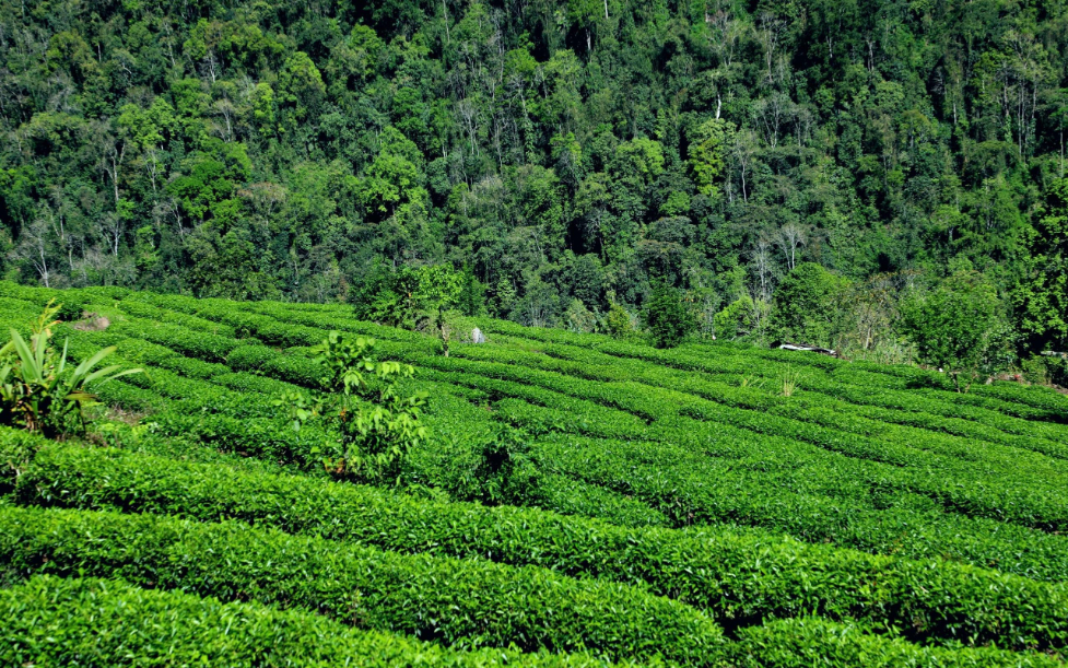 沿着宽敞整洁的道路驱车上山,来到革林茶场,一路绿树成荫、栉比鳞次,仿佛置身于一片绿色的海洋。微风吹过,茶树摇曳生姿,阳光透过稀疏的云层,洒在茶叶上,泛起点点金光。