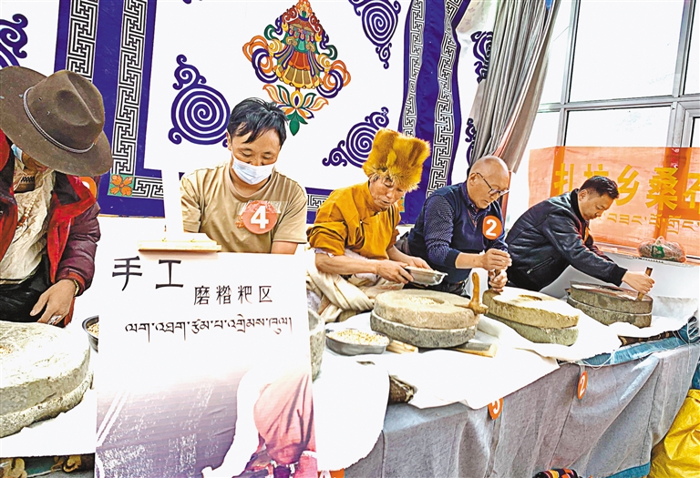 第三届“乡村振兴 那曲奋进”活动中,比如县扎拉乡桑布村群众在村级初赛中比拼手磨糌粑技能。记者 潘多 摄